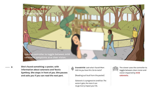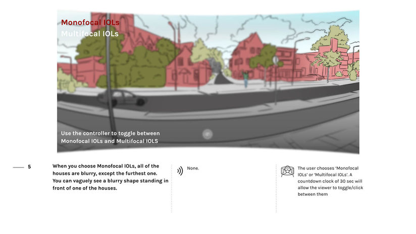 We'll let our viewer toggle between symptoms and 'clear' vision, ultimately creating an interactive experience that's easy to navigate. The viewer will experience symptoms of mild, medium and severe cataracts.